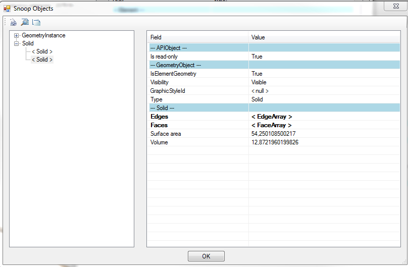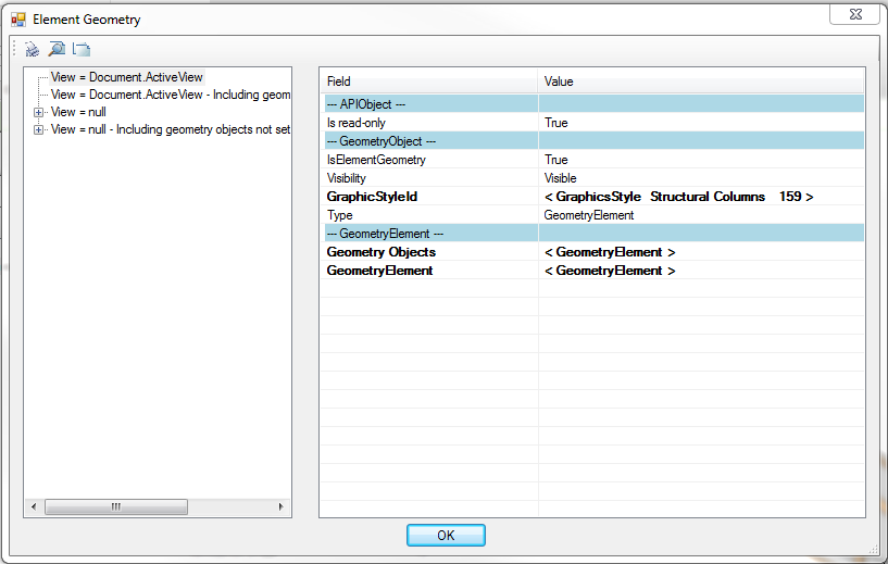 Afortunadamente alguien ya hizo el trabajo de programar una utilidad que utiliza el API para mostrar todos los parámetros ocultos de nuestro modelo. Esta utilidad se conoce como RevitLookup. Con Revitlookup, podemos inspeccionar una columna, explorar hasta que lleguemos a la sección de geometría, donde vemos lo siguiente: