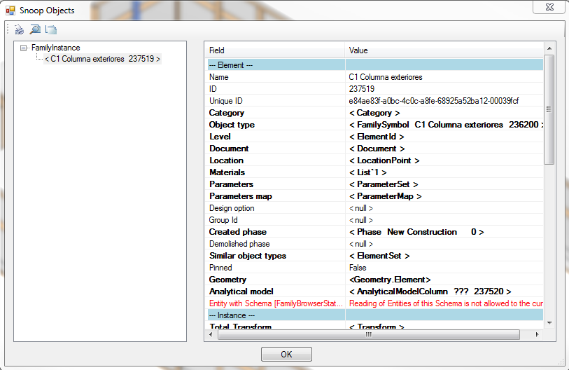 Por ejemplo en este caso estamos explorando una columna. Del lado izquierdo aparece solo la columna que seleccionamos («C1 columna exteriores»), que es un elemento tipo FamilyInstance (una categoría interna que usa Revit para los elementos de modelo). Del lado derecho podemos ver la información de la columna. Nos aparecen sus identificadores común y único (ID y UniqueID). Después de eso aparecen un montón de renglones en negrita, esto nos indica que son subcategorías de información (algo como las carpetas y subcarpetas en un disco duro). Si hacemos click en alguno de estos renglones, se nos abre otra ventana más, con el contenido de esa subcategoría. Por ejemplo si pedimos la categoría «Geometry»: